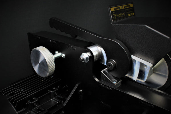 Another key feature of the Gibson grinder is the adjustable tensioning mechanism. The grinder tensioning mechanism uses a combination of acetyl bushes and a cam mechanism to easily and infinitely adjust your belt tension to suit the job. Simply use the ergonomic tensioning handle to tighten or loosen the belt. This feature comes in especially handy for using slack belts, and makes belt changes a quick, single-handed operation.