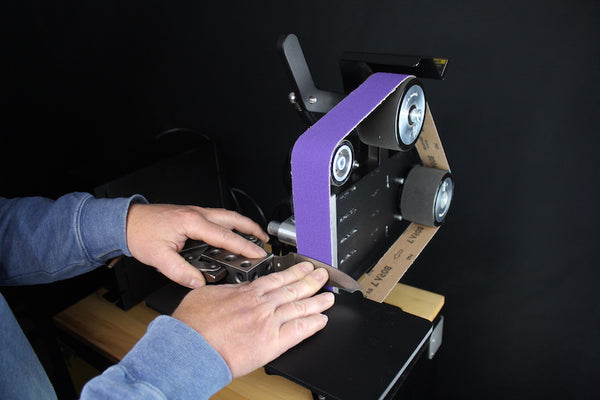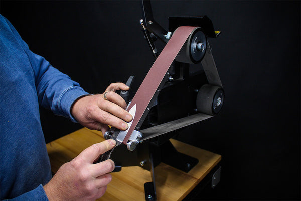 Effortlessly and efficiently configure the grinder to flatten material, rough out a knife blank and shape a handle - all without the need for tools! (Changing belts is just as easy).